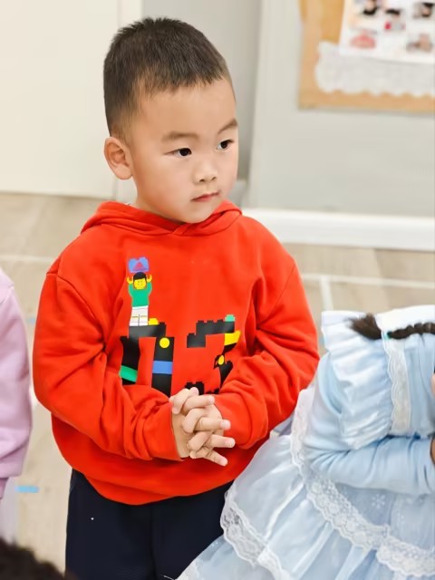 今天的音乐课上,我们延续了“制作披萨”的律动游戏,只是把上周每人一条的纱巾换成了一个大大的彩虹伞。孩子们围成一圈,每人抓住伞的一角,一起跟着音乐模拟整个做披萨的过程:倒面粉、转圈和面、往前推擀、双手拍饼,再大方地说出自己喜欢的口味,把芝士、番茄酱、胡萝卜等配料撒在面饼上。因为是大家一起撑起彩虹伞,每个动作都需要互相配合、用对力气,节奏才能整齐。最后,老师们抓住彩虹伞,孩子们欢笑着钻到伞下,假装披萨正在烤箱里烘烤,整个课堂热闹又温馨。孩子们不仅继续巩固了对音乐节奏的感知,更在集体协作中学会了倾听与配合,用身体把一首简单的律动变成了属于大家的故事。