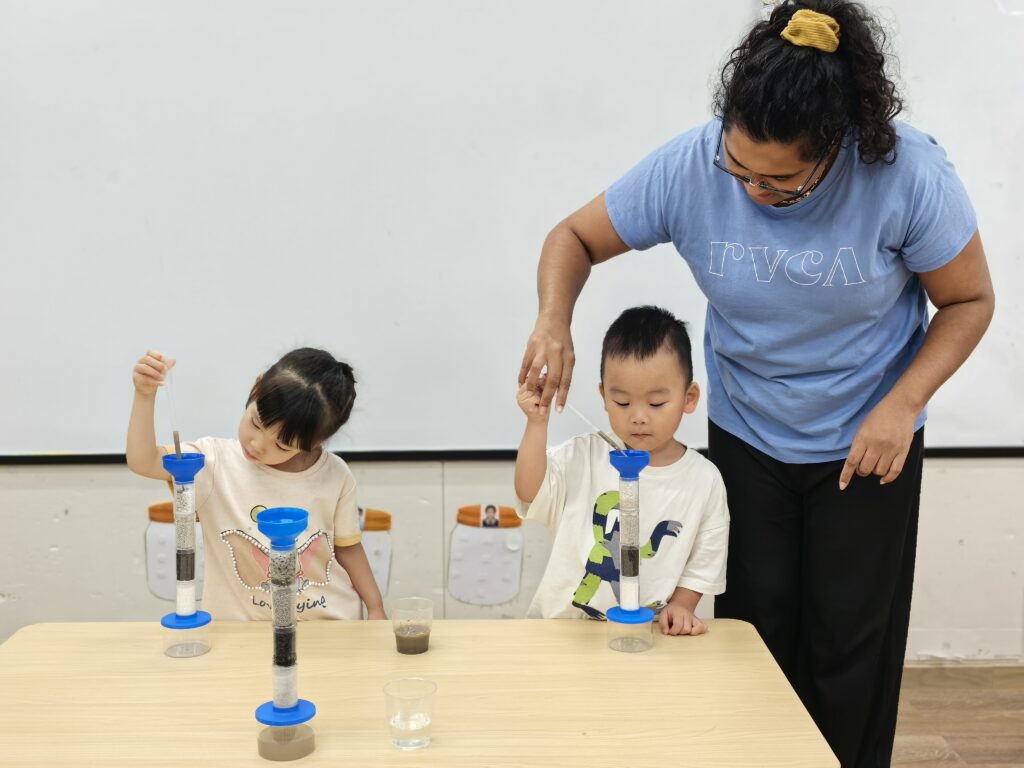 The kids sharpened their hand-eye coordination and fine motor skills during this hands-on activity. Armed with pipettes, they eagerly transferred muddy water into the filter, watching with wide eyes as the purification process unfolded. The anticipation in the room was electric as they patiently waited to see the water start to clear up. What a thrill it was to see the water flowing through each level of the filter!