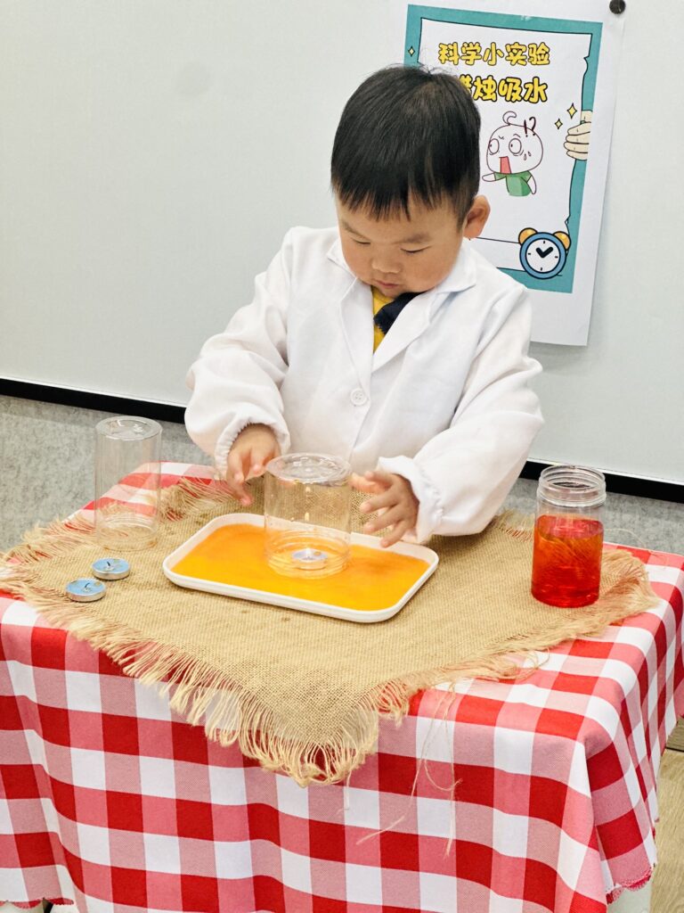 故事结束后,孩子们变身成了小小科学家,开始了探索自然奇迹:“蜡烛吸水”小实验,从蜡烛吸水的实验中,小朋友们直观的看到,燃烧消耗掉空气中的氧气,蜡烛熄灭,水位上升,小朋友惊呼实验的有趣和空气的神奇,揭露了空气的奥秘!
