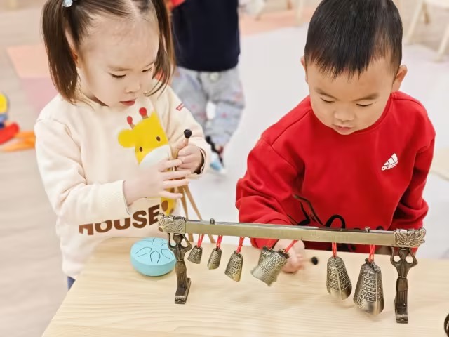 今天,我们如约走进了云冈石窟壁画中的音乐世界,亲手触摸了昨天在音乐窟壁画中看到的那些古老乐器。孩子们从壁画走进现实,在猜猜、摸摸中真切地认识了琵琶、细腰鼓和埙这三种古老的乐器。课上孩子们好奇地观察、大胆地猜测、积极地模仿——小手轻轻弹拨琵琶;拍拍细腰鼓,敲出咚咚的节奏;鼓起小嘴吹奏陶埙(虽然不得要领没有发出声音)。在随后的乐器宝宝找家游戏中,孩子们都能准确地将不同乐器按演奏方式分类,送它们回到弹弹屋、拍拍屋和吹吹屋。最后的宫廷音乐会更是把气氛推向高潮,当老师发出指令,孩子们同时化身小乐手,用稚嫩动作和拟声演绎了一场穿越千年的童趣合奏。