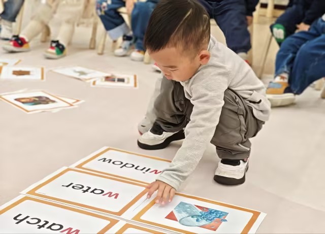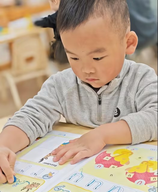 今天的Phonics课聚焦字母R的书写与R开头的相关单词的认知。孩子们首先跟着书写轨迹练习了小写r的规范写法,接着通过驯鹿(Reindeer)、彩虹(Rainbow)的单词配图和卡片配对游戏,熟悉R的发音与相关词汇,最后还借助连线、剪贴的形式,在动手过程里巩固了对字母R的发音认知,也学习了与R为首的两个单词。