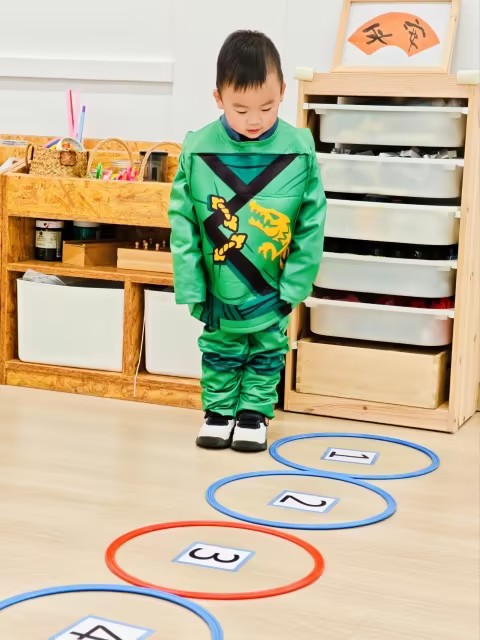 In Chinese class, the children reviewed numbers up to 15 and learned how the quantity and numeral changes when one more is added to any given number. To assist the children understand this concept, they hopped along a large number from one number to the next. The children also practiced counting small objects, counting out one more than a given number.