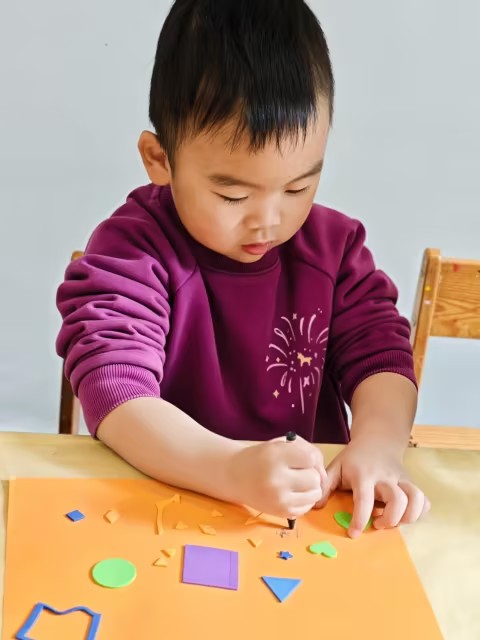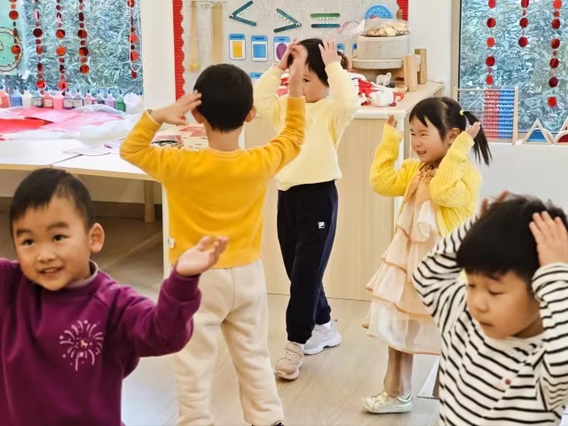 今天的艺术课上,孩子们继续发挥创意,给上周拼贴好的形状世界添上了更多细节。她们用五颜六色的蜡笔,在自己的作品上加了各种跟上周拼好的场景或故事相关的元素。有的在“海边捡小鱼”里添上了贝壳、小船;还有的把“气球舞会”画得更热闹了,增加了好多笑脸。课上,孩子们不只是画画,更是在学习怎么把一个小场景变得更完整、更有故事感。大家都特别投入,作品也越来越生动有趣。
