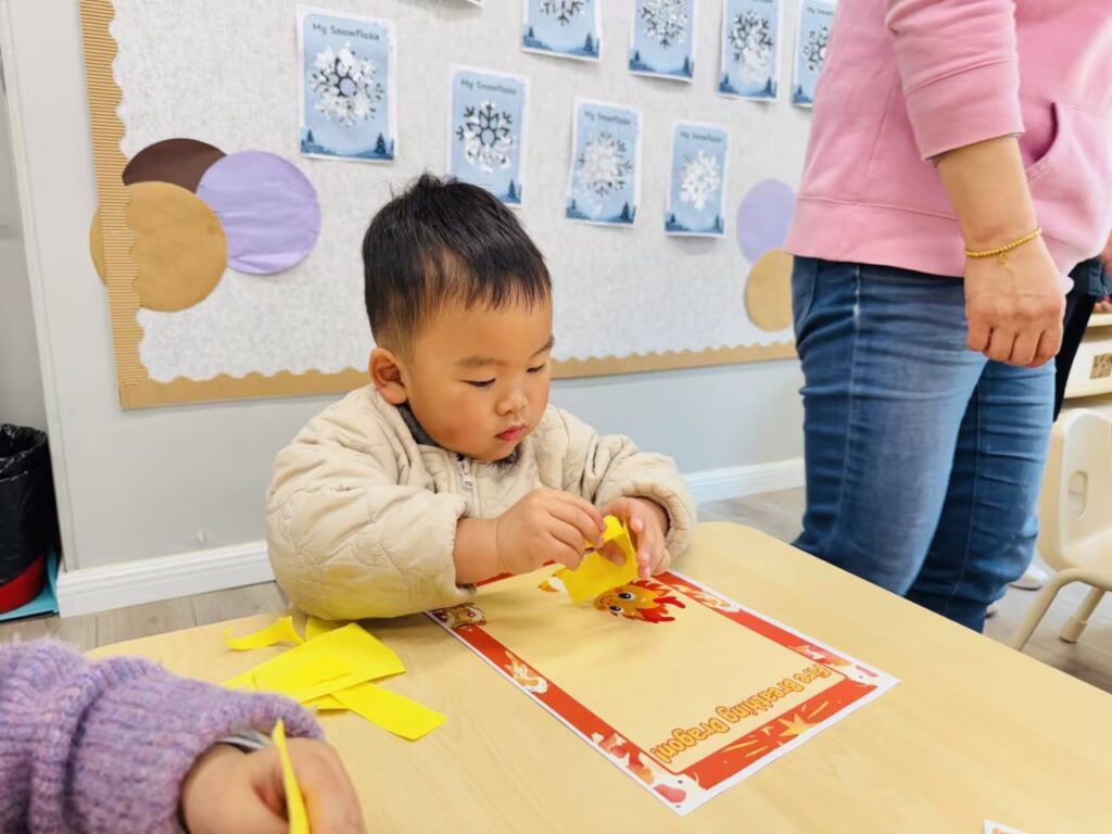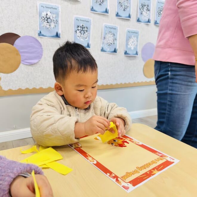 In our class we practiced the motions for our ‘happy new year’ song ready for a show in tomorrow’s class 🎤. Next, we practiced the word ‘dragon’ and ‘fire’ calling out loud all the colours we could see ‘orange, yellow and red!’. We also tried taking a big breath and breathing fire like a dragon 🐉 🔥 After looking at a picture of a ‘Mummy dragon’ we decided to help give a ‘baby dragon’ some fire. We ripped yellow and orange paper and made a beautiful collage. Excellent practice for our fine motor skills! ✨ Well done to all the little ones today, I look forward to seeing you again on Thursday morning!