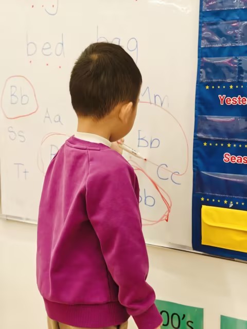 In phonics, the children learned the letter Bb. They identified the letter in upper and lowercase, learned vocabulary beginning with the letter and used the letter’s sound to blend unfamiliar words.