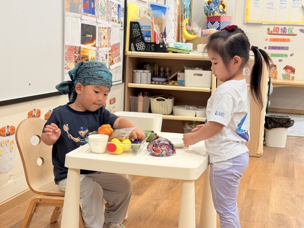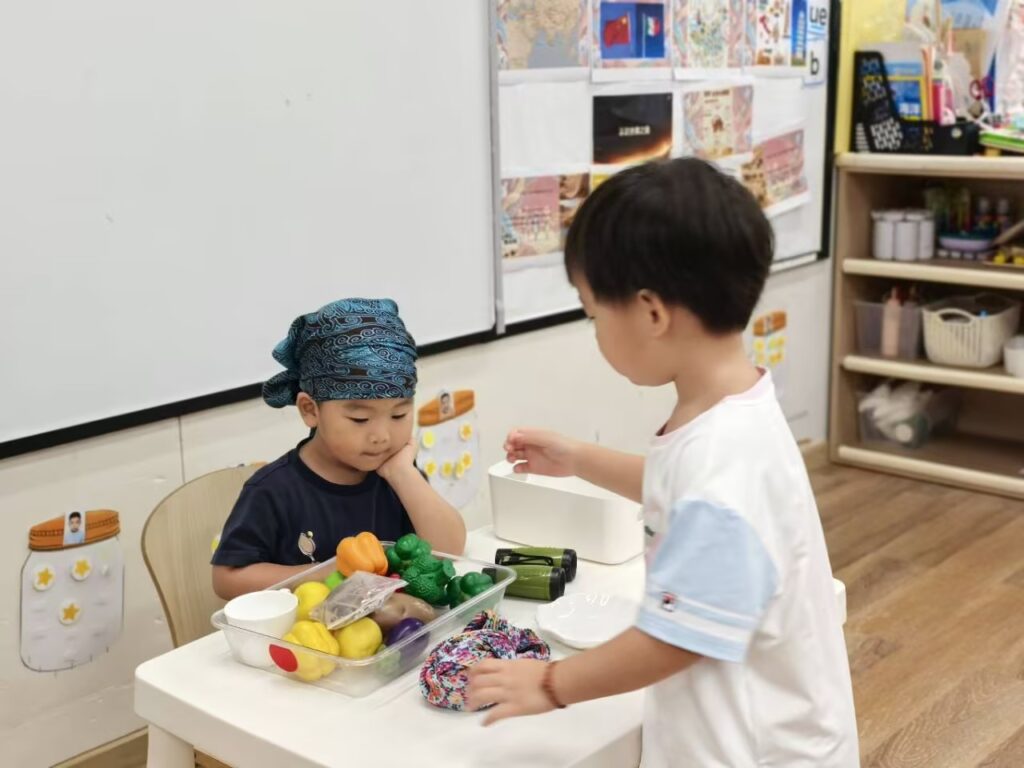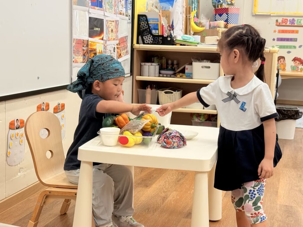 今天我们还认识了货币,一起了解了货币的作用。孩子们纷纷积极发言:“钱可以买玩具”“可以买水果”“还能买衣服”……每个小朋友都在认真开动小脑筋,想法特别多呢!接下来的角色扮演贸易环节更热闹啦:小朋友们轮流到贸易市场挑选商品,学着进行交易,大家还会主动说“你喜欢这个吗?我想换你的丝绸”,顺利完成了一次次有趣的商品交换和买卖,可爱又投入~
