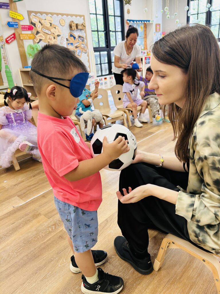 To test their learning, we played a blindfold guessing game — “Which ball is this?” they asked with giggles as their friends guessed by touch.