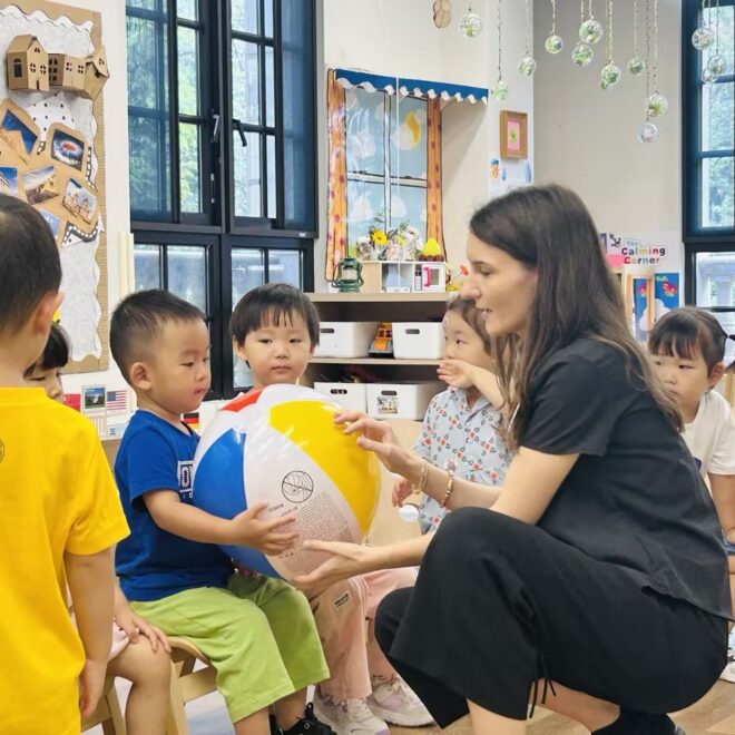 To make the lesson even more active, we played with colorful beach balls! The children warmed up with simple exercises, then took turns tossing and catching the light, soft balls before playing together in a joyful group game. 🎉
