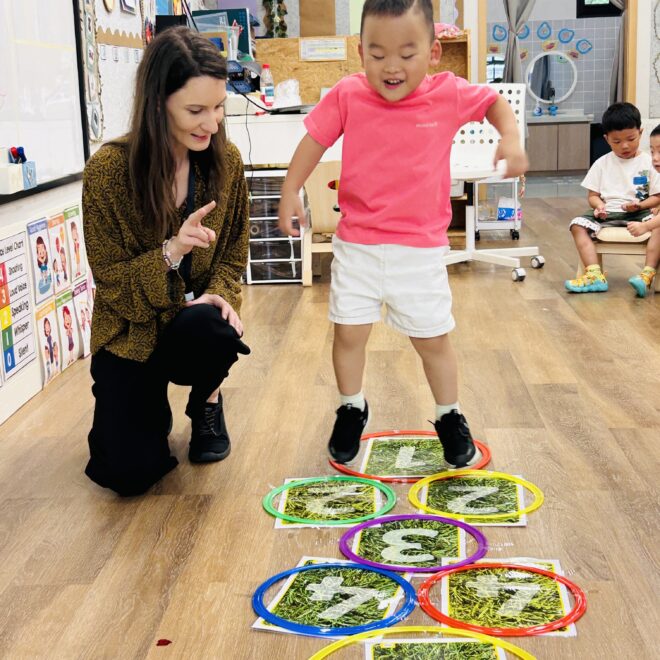 We reviewed the numbers, from 1 to 10, and the body-related words, such as leg, arm, hand. We also introduced new words to describe the jumps: straight jump, star jump, half-turn jump!😊