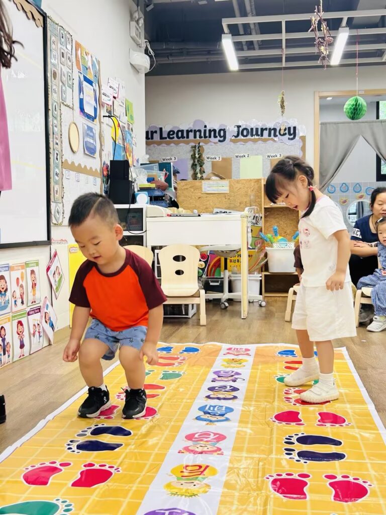 Before starting the final game, we reviewed the words “Hand” and “Foot”, and then we gathered in the center of the room, unfolding the Game Mat. After the brief teachers’ demonstration, in pairs, the children began jumping on the Game Mat, moving forward, turning right, left, and backward. Full of excitement, they all joined in, testing new moves while reinforcing vocabulary.