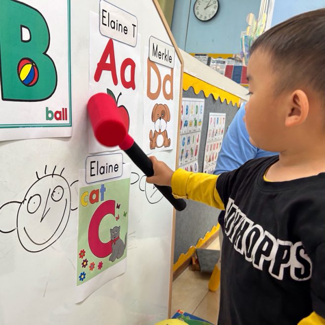 What we did today: 06/05/2024 Morning schedule: In the morning we had the morning circle time. Afterwards, they had an English class. Then they had an outdoor exploratory play and walk. Thereafter, they had a Chinese class and listened to a story. Song we sang: Hello, how are you, baby shark , Finger family Daily talk: How are you?: I’m happy,I’m sad,I’m angry (use your name and stick it next to the funny face) Review colours: red yellow orange blue purple Letters review: A,B,C,D Words: Apple,ball,cat,dog Art and craft: Find and colour letter Aa Hammer game: find letters and punch it Short story: Dinosaurs Galore Afternoon schedule: Story reading: That’s not my dog. That’s not my pony