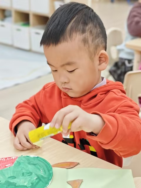 今天的艺术课上,孩子们继续他们的毕加索风格人脸创作。这是这个系列课程的最后一节,大家把前两节课的作品整合在一起,开始动手拼贴。孩子们先在涂好颜色的半圆形面孔上,将上周准备好的五官图形按照毕加索的方式进行组合——正面的眼睛配上侧面的嘴巴,鼻子延伸到额头上,脸部结构被有趣地分割开来。为了让五官看起来更有立体感,大家还想了个巧妙的办法:用长方形的纸折成弹簧状,把第一周画的五官先贴在弹簧上,再把这些“弹簧五官”粘到面孔上。这样一来,眼睛、鼻子、嘴巴都从画面上“跳”了出来,显得格外生动,还真有点毕加索的味道呢!