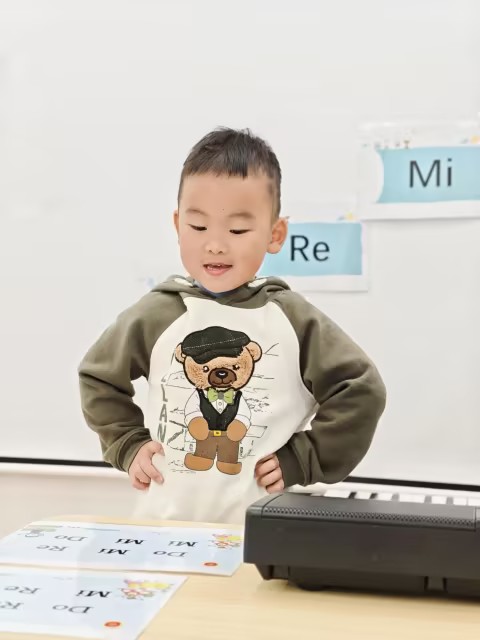 在今天的音乐课上,孩子们首先跟着琴声复习了音阶《Do Re Mi》,随后在声音爬楼梯的游戏中,在原有的Do、Re、Mi基础上认识了新朋友——音阶Fa,初步感受Fa的音高位置。接着,孩子们继续开展视唱挑战环节,老师出示“Do Mi Re Mi Mi Do”卡片,引导孩子们尝试唱出这段旋律。孩子们分组跟随老师的琴声和手势,认真调整发声,在游戏中进一步巩固了这几个基础音阶的音准及简单组合。