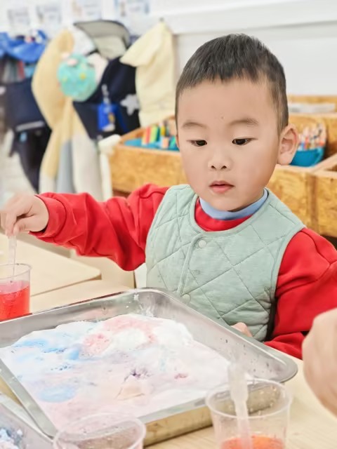 In phonics, the children concluded the week with a fun science experiment to experience the word ‘fizz.’ The children added coloured vinegar with water droppers to a base of baking powder and observed the resulting fizzing reaction.