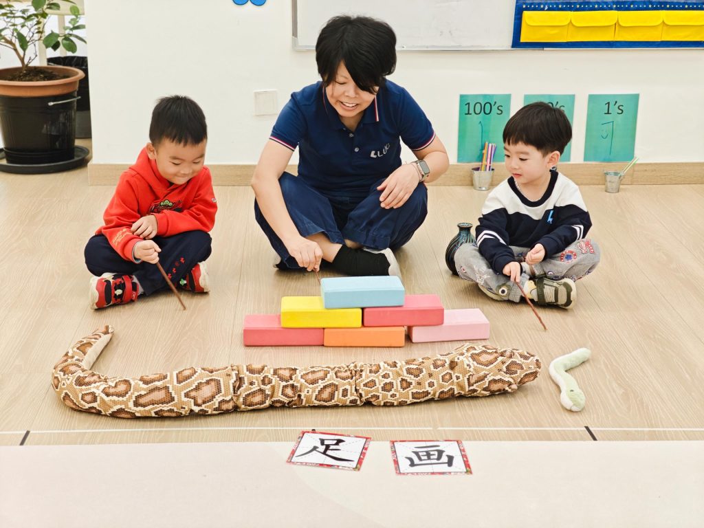 中文课我们学习了寓言故事《画蛇添足》。课堂上,孩子们先观察蛇玩偶,确认“蛇没有脚”,随后带着“给蛇画脚会发生什么”的好奇心听老师讲述故事。大家被有趣的情节吸引,明白了那个人因为多此一举而输掉酒的道理。在理解故事的基础上,孩子们尝试将打乱顺序的故事图片按“先画完蛇—添脚—被抢走酒”的顺序重新排列,并用简单的语言讲述每个画面。最热闹的是角色扮演环节,扮演画蛇人的孩子得意地说“我再给它画几只脚”,扮演抢酒人的孩子大声喊“蛇没有脚”,围观的孩子也跟着笑起来。通过表演和讨论,孩子们不仅初步理解了画蛇添足的意思,还认识了汉字“画、足”。整节课孩子们听得认真、说得热闹、演得开心,在笑声中记住了这个有趣的成语故事。