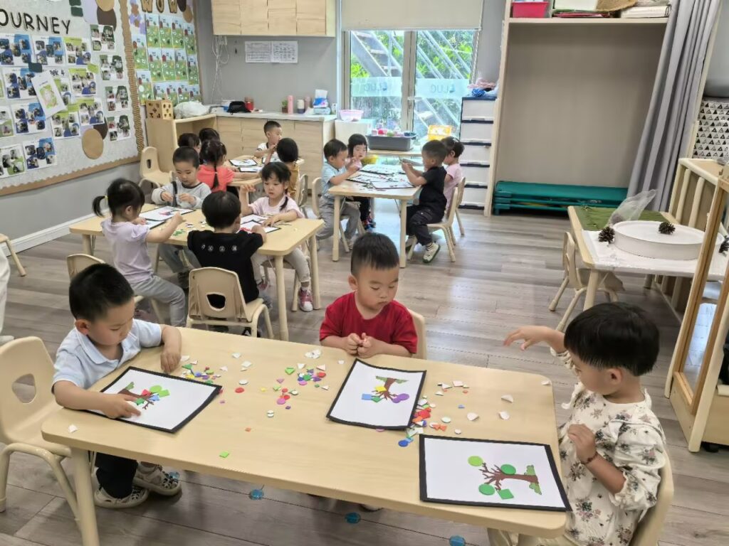 故事结束后孩子手工制作了彩色的形状树。