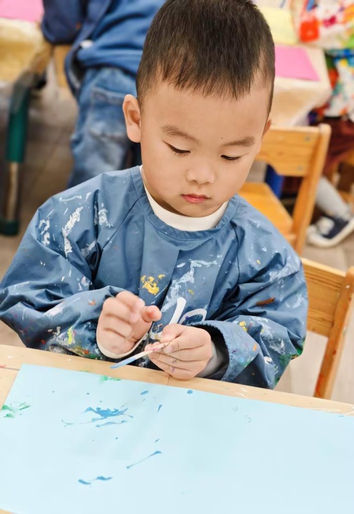 在今天的艺术课上,孩子们首先欣赏并观察了Jackson Pollock的作品,然后在老师的示范、讲解下开始自己的创作,她他们用刷子蘸取颜料放在作品上方,然后用木棒轻轻敲击刷子,让颜料溅落到纸上,随意溅落的颜料在纸上相互叠加、交织从而形成一幅Pollock风格的作品。
