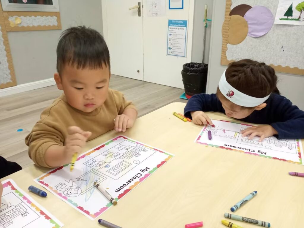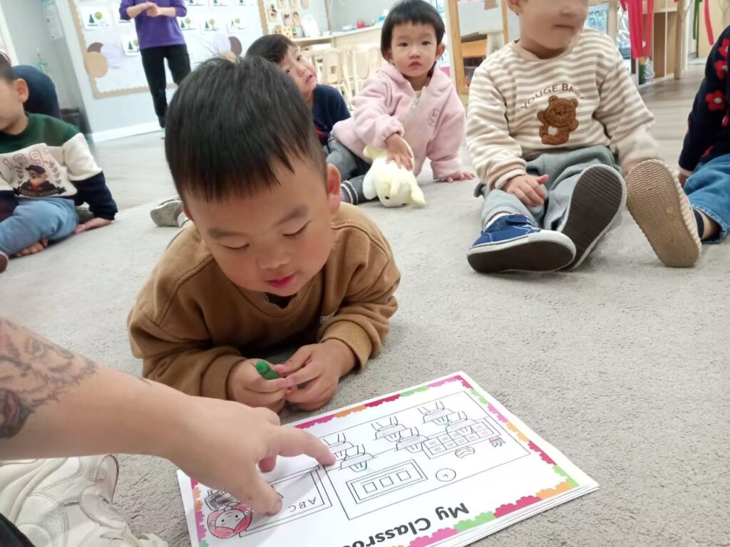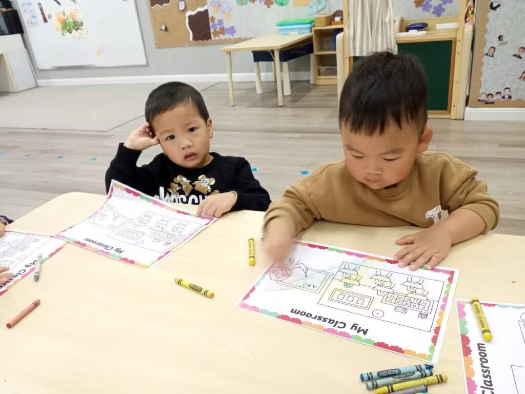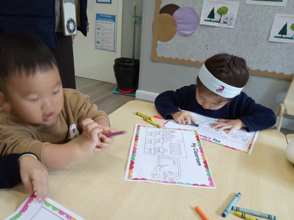 We explored all about the school, and our classroom, including our teachers and friends! We looked at our hair color, clothes color, and classroom colors. Then, we colored in a beautiful classroom and teacher picture, making sure to try our best and color small areas.