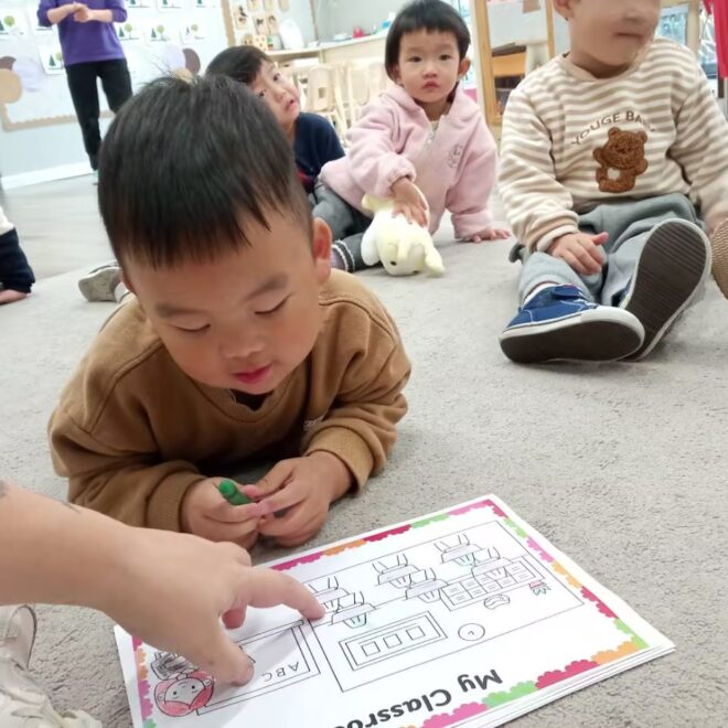 We explored all about the school, and our classroom, including our teachers and friends! We looked at our hair color, clothes color, and classroom colors. Then, we colored in a beautiful classroom and teacher picture, making sure to try our best and color small areas.