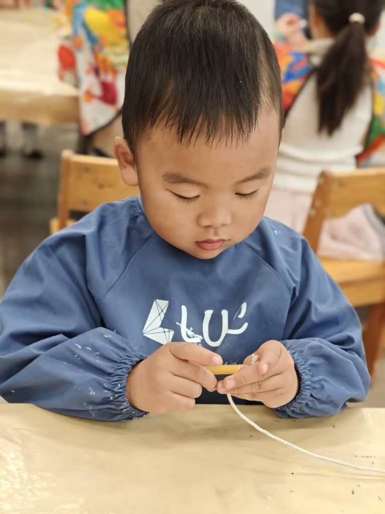 今天的艺术课上,孩子们在老师的带领下走进充满魅力的非洲 bead art 世界。孩子们首先观察了色彩浓郁、纹样独特的非洲传统串珠项链。接着她们亲自动手,将粗细不同的意面仔细地穿在绳子上,设计制作出属于自己的独特项链。最后,每个孩子都为作品挑选了最具代表性的颜色,细心为意面上色,就这样独具个性的非洲风情项链初具雏形,等它晾干后下周孩子们将继续进行创作。