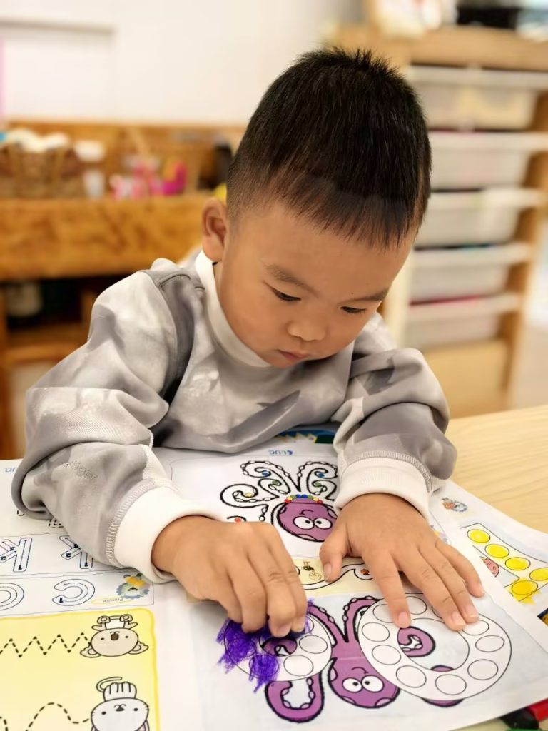 英文Phonics课主要围绕字母O展开,孩子们愉快地复习字母O的名称与发音,并通过游戏互动学习了相关词汇。在书写环节,孩子们以小组形式重点进行了运笔技能练习,她们通过描线和描红的方式,练习了字母的大小写书写,为今后的规范书写打下了良好基础。