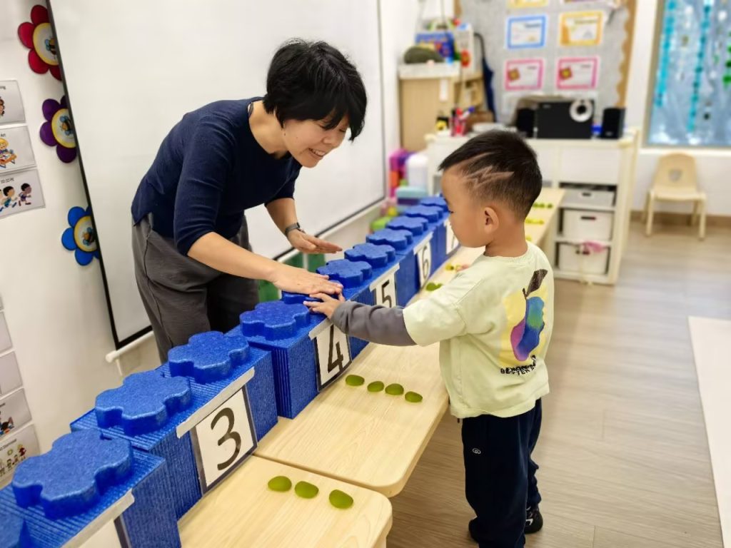 今天的英文数学课可真热闹!孩子们都变成了小小实验家,围着水盆忙个不停。大家用大大小小的杯子舀水,然后倒进一样的透明瓶子里。有的小朋友用胖胖的杯子舀一下,就能让水位涨得老高;有的用瘦瘦的杯子要舀好几次,才发现水位才爬了一点点。最神奇的是,当发现用不同杯子装水、最后水位竟然一样高时,好多小朋友都睁大了眼睛——明明用的杯子不一样大呀!在哗啦啦的水声和惊喜的欢笑声中,孩子们一边玩水,一边用英文表达,如“more water”、“less water”,还不知不觉地发现了“看起来不一样,其实一样多”的秘密!