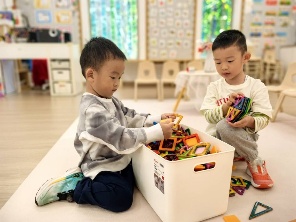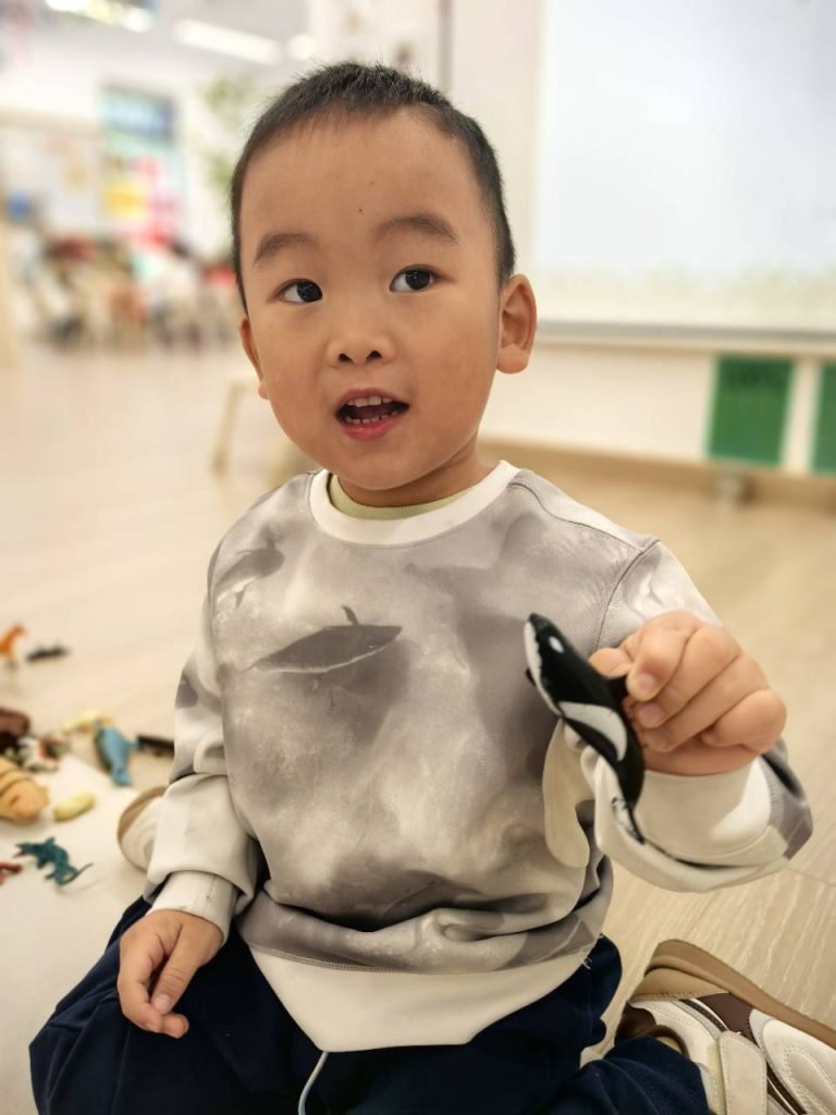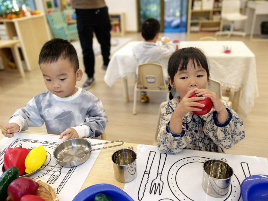 In Chinese class, the children reviewed their learning about rooms of a house and each room’s function. The classroom was made into a home for the children and they role-played typical activities that take place in each room.