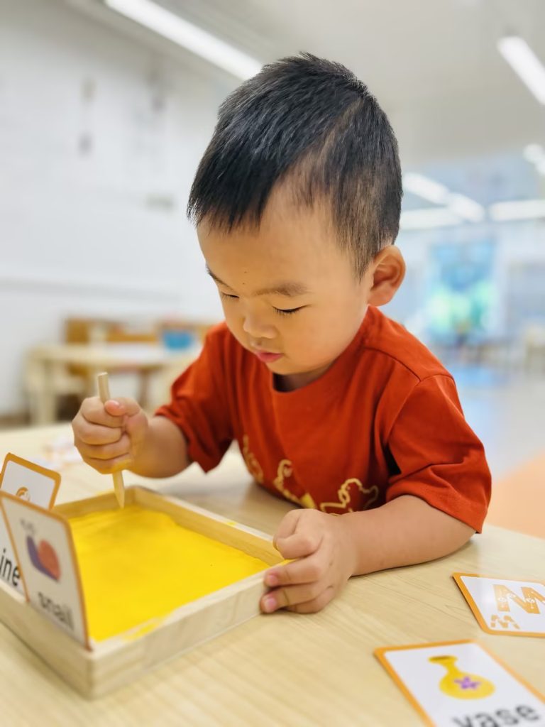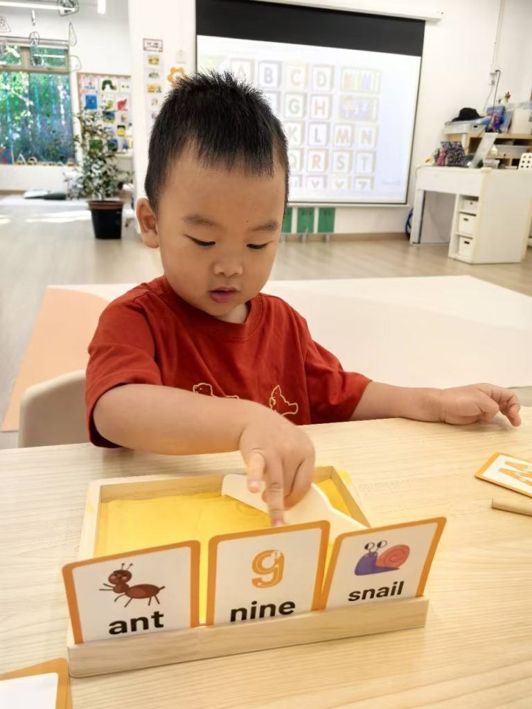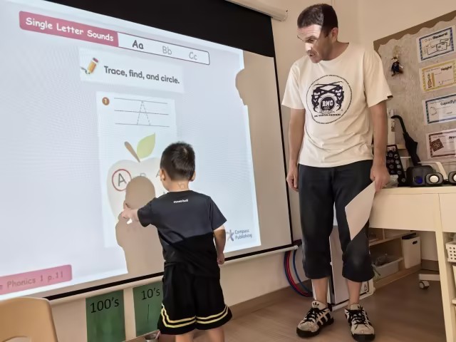 今添英文Phonics课聚焦字母A的名称与发音学习。孩子们通过听辨和跟读,熟练掌握了A的发音/æ/及代表性单词,如ant\apple\alligator等。在有趣的互动拼图游戏中,孩子们仔细观察被逐块揭示的图案,积极推断并抢答出以A开头的单词(如ant),成功将字母发音与词汇形象联系起来,有效锻炼音素意识和早期拼读能力。