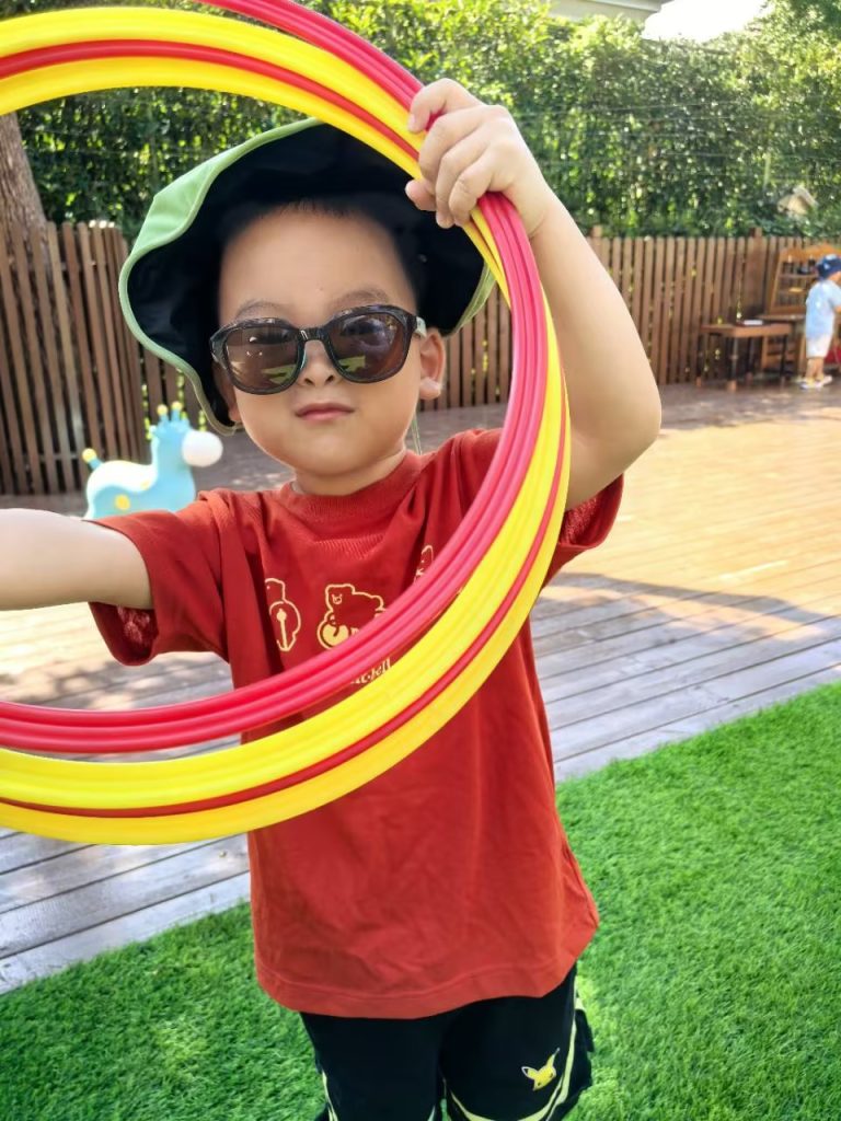 英文数学活动围绕15以内数字的认知展开。孩子们首先通过一段生动的动画视频,在虚拟公园场景中寻找隐藏的数字,并将数字与具体数量进行匹配,如发现5枝花对应数字5,10只蝴蝶对应数字10,建立数物对应的概念。随后开展的投掷沙包游戏孩子们也非常喜欢:老师在地面放置多个带有数字的圆环,邀请孩子们在离圆环三步左右距离的地方投掷沙包。当沙包落入标有数字的圆环时,孩子们需要准确地用英文报出数字,如”seven”、”twelve”等。游戏过程中孩子们兴致高昂,在欢乐的氛围中自然巩固了数字认读能力。