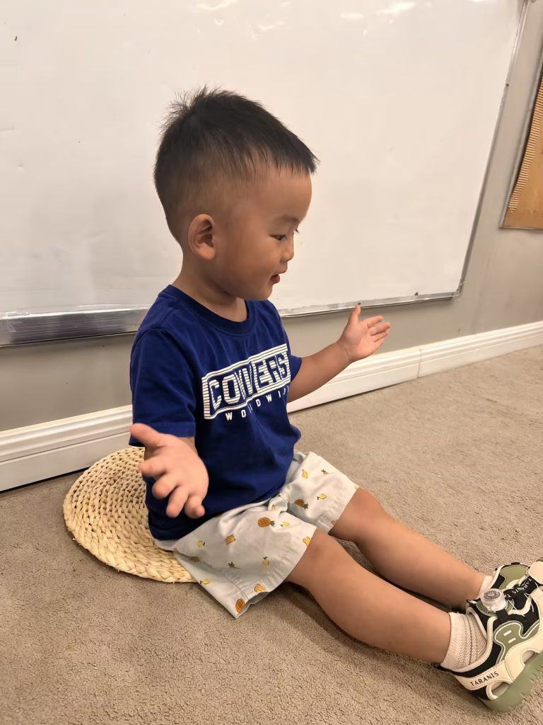 今天我们复习了昨天的活动——动物叫声猜猜看,老师出示小动物的图片,鼓励孩子们模仿动物的叫声,丰富孩子们的动物知识,同时锻炼孩子的听力和模仿能力以及语言表达能力。